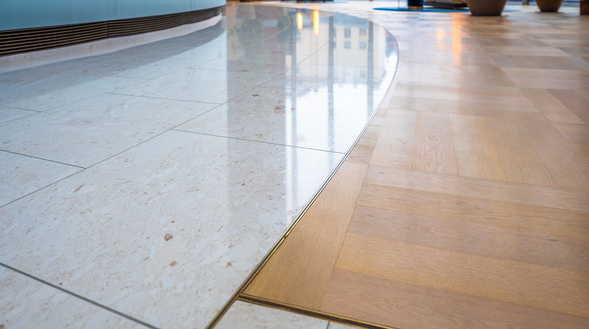 In Kombination mit der zum System gehörenden DITRA-Verbundentkopplung entstand eine harmonische, weitgehend fugenfreie Fläche aus großformatigen, wärmeleitfähigen Natursteinplatten sowie angrenzendem Parkett. Das Ergebnis überzeugt nicht nur technisch und optisch – auch die Energieeffizienz sorgt bei den Eigentümern für Freude. Ein weiteres echtes Plus: Mit BEKOTEC-THERM verkürzte sich die Bauzeit um mehrere Wochen. Das war ein entscheidender Vorteil – denn die Lobby blieb während der Sanierung in Betrieb.