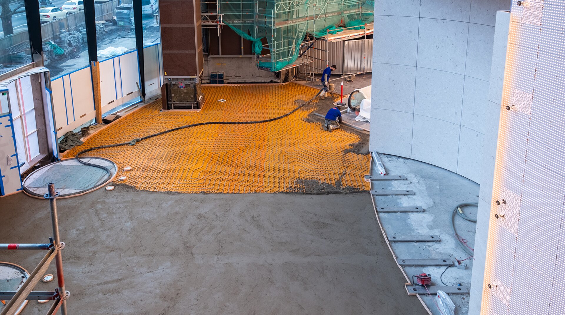 Der markante Frankfurter Messeturm – weithin als „Jahn-Tower“ bekannt – präsentiert sich seit Ende 2023 in neuem Glanz. Im Zuge der Modernisierung der Lobby wurde auf rund 1.100 Quadratmetern die energiesparende Fußbodenheizung Schlüter-BEKOTEC-THERM verlegt. Und das bei laufendem Betrieb.