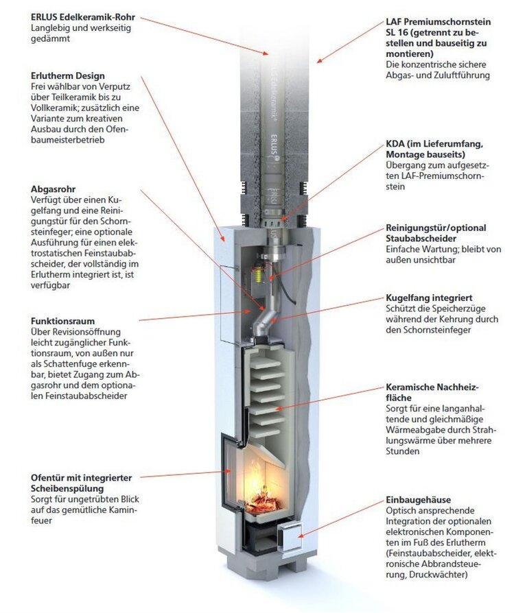 Wärme, die man spürt – Geborgenheit, die bleibt. Der ERLUS Erlutherm bringt gesundes Wohlfühlklima ins Haus, mit sanfter Strahlungswärme und nachhaltiger Effizienz. Das neue Premiumprodukt von ERLUS ist sparsam, bedienungs- und wartungsfreundlich. Der Erlutherm ist Speicherfeuerstätte und Schornstein in einem, das spart Platz im Wohnraum. Der Speicherofen im Schornstein macht das Haus wärmeautark und ist eine ideale Ergänzung zu jeder Zentralheizung und ganz besonders zur Wärmepumpe. Den Erlutherm gibt es in vier Ausführungen: Basic, Keramik, Keramik Deluxe und Kreativ. Durch seine raumluftunabhängige Bauweise kann der Erlutherm problemlos mit einer kontrollierten Wohnraumlüftung kombiniert werden. Die optionale Integration von Feinstaubabscheider, Abbrandsteuerung und Druckwächter macht das System besonders effizient und umweltfreundlich.