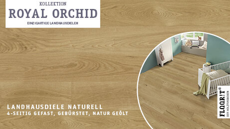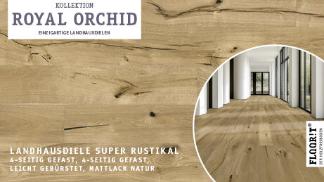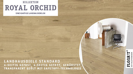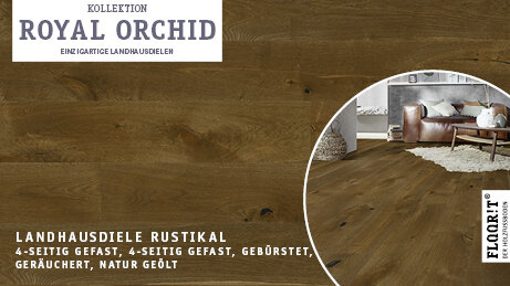 Royal Orchid verbindet natürliche Ästhetik mit vielfältigen Sortierungen von Naturell bis Super Rustikal. Hochwertige Oberflächen – naturgeölt, transparent geölt mit SafeTop Technology, mattlackiert oder geräuchert naturgeölt – sowie gebürstete Ausführungen unterstreichen die authentische Holzstruktur.