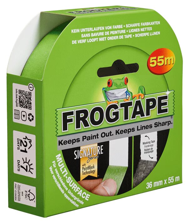 Dank der innovativen PaintBlock-Technologie verhindert FrogTape® zuverlässig das Unterlaufen von Farbe. Die Mikrobarriere an den Bandrändern verhindert das Unterlaufen von Farbe und sorgt so für scharfe Farbkanten. Mit nur einem Arbeitsschritt ist man fertig – kein Vorstreichen mehr nötig. Mit FrogTape® kann man sich auf das beste Ergebnis verlassen, ohne mühseliges Nachbessern. FrogTape® kann auf verschiedenen Oberflächen verwendet werden und bietet somit vielseitige Anwendungsmöglichkeiten. Egal, ob erfahrener Heimwerker oder DIY-Anfänger, dank FrogTape® Multisurface gelingt das Streichen im Handumdrehen.