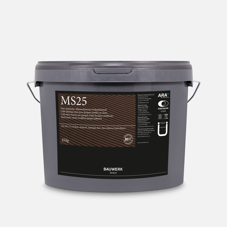 MS25 ist als wasser- und lösungsmittelfreier silanmodifizierter Klebstoff für die Verklebung von Bauwerk Parkett auf geeigneten und belegereifen Untergründen wie u.a. Calciumsulfat- oder Zementestriche oder Verlegeplatten aus Holzwerkstoffen oder auf Calciumsulfatbasis geeignet. Eine Grundierung ist in der Regel dabei nicht erforderlich. Er erfüllt die Anforderungen der ISO 17178. Für Musterverlegungen empfehlen wir den Bauwerk Parkett Klebstoff MS35/MS70. Der Klebstoff bietet eine lange offene Zeit von 60 Minuten und erleichtert das Auftragen mit dem Zahnspachtel.