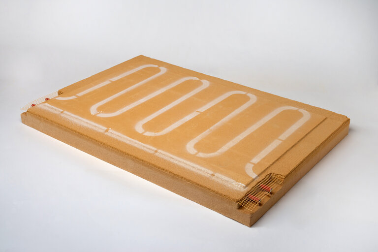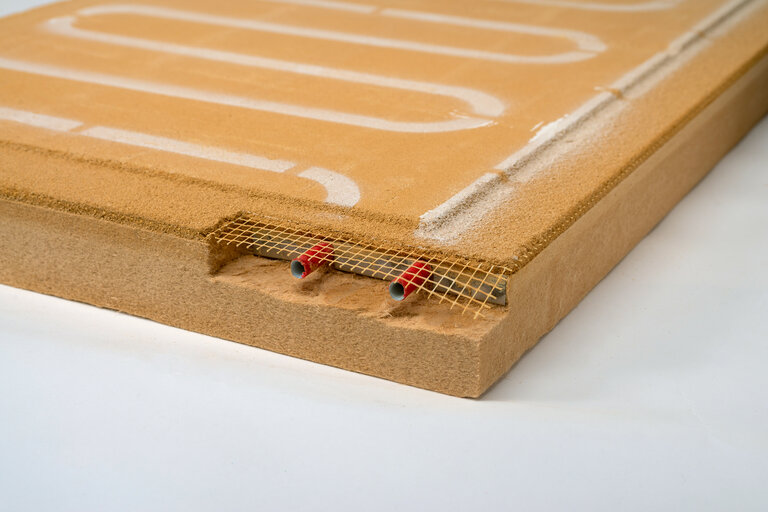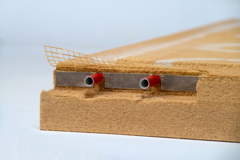 Einzige Lehmbauplatte mit integrierter Innendämmung durch 60 mm Holzweichfaserplatte als Trägerplatte und integrierter Wandheizung/-kühlung