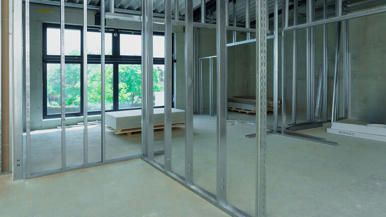 - Kleben von Trockenbauständerwerk zur schraubenlosen Montage der Metallschienen / UW-Profile