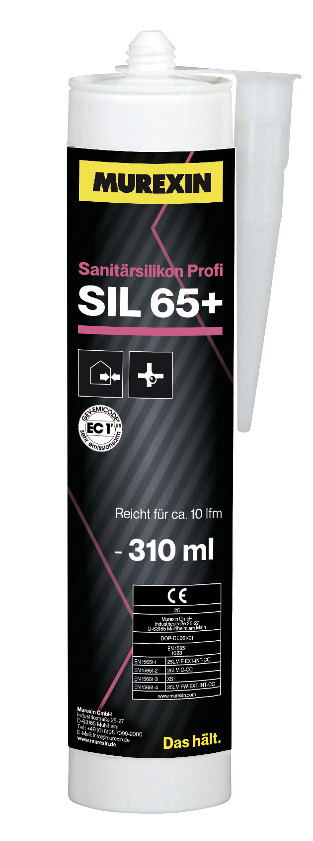 Sanitär Silikon Profi SIL 65+ ist ein lösemittelfreier, UV-, witterungs- und alterungsbeständiger, wasserdichter, bis 25% dehnfähiger, sauer vernetzender Silikondichtstoff (Acetatsystem) für den elastischen Verschluss von Rand-, Dehn- und Feldbegrenzungsfugen von z. B. keramischen Fliesenbelägen, korrosionsgeschützten Metallen, Emaille, viele Kunststoffe, Hart-PVC. Innen und außen. Hohe chemische Beständigkeit. Geeignet im Nassraumbereich und für Anschlussfugen an Fremdmaterialien. Bester Schutz vor Bakterien und Pilzbefall. Sehr gut modellierbar und lange Zeit glättfähig. Sehr emissionsarm. Große Farbvielfalt. Nicht für Naturstein und nicht unter Wasser.
