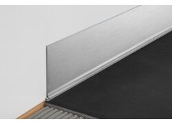 Schlüter-DESIGNBASE-SL ist ein hochwertiges Profil zur Erstellung von Sockelbekleidungen. Schlüter-DESIGNBASE-SL-E aus gebürstetem Edelstahl (V2A) ist in den Höhen 110 und 160 mm erhältlich. Das Profil wird rückseitig mit geeignetem Montagekleber (z.B. Schlüter-KERDI-FIX im Wandbereich fixiert. Optional kann es mit einer als Zubehör erhältlichen Dichtlippe ausgestattet werden, um die Randfuge vor dem Eindringen von Feuchtigkeit zu schützen und die Übertragung von Trittschall zu reduzieren. Für die einfache und dekorative Verbindung von DESIGNBASE-SL, auch an Innen- und Außenecken, sind passende Metallformteile sowie Endkappen erhältlich. (Produktdatenblatt 16.2)