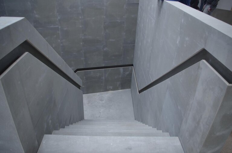Die Platte ist eine zementgebundene Spanplatte mit einer glatten Oberfläche, in der Masse mit schwarzem Pigment durchgefärbt.