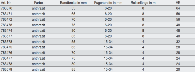Rollen-Einzel-Kennzeichnung mit Verwendbarkeitsangabe der jeweiligen Fugenbreiten