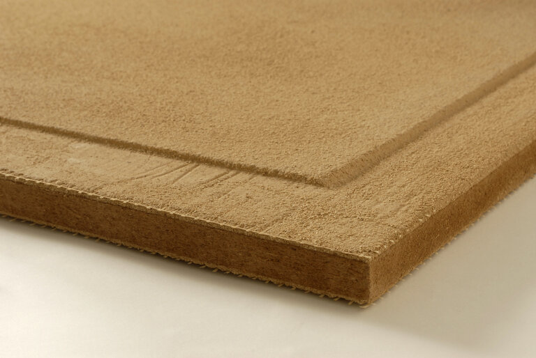 Einzige Lehmputz-Trockenbauplatte, basierend auf einer Holzweichfaserplatte, die mit 10 mm reiniem Lehmputz ohne Zuschlagsstoffe verputzt ist.