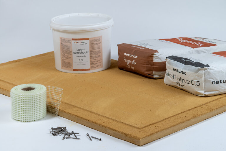 Im Komplattepaket für die fertige Wand oder Decke enthalten sind: Lehmbauplatten 1250 x 625 x 30 mm, Schrauben oder Lehmkleber für Montage, Armierungsgewebe, Fugenmaterial, weißer Finishputz und Lehmstreichputz