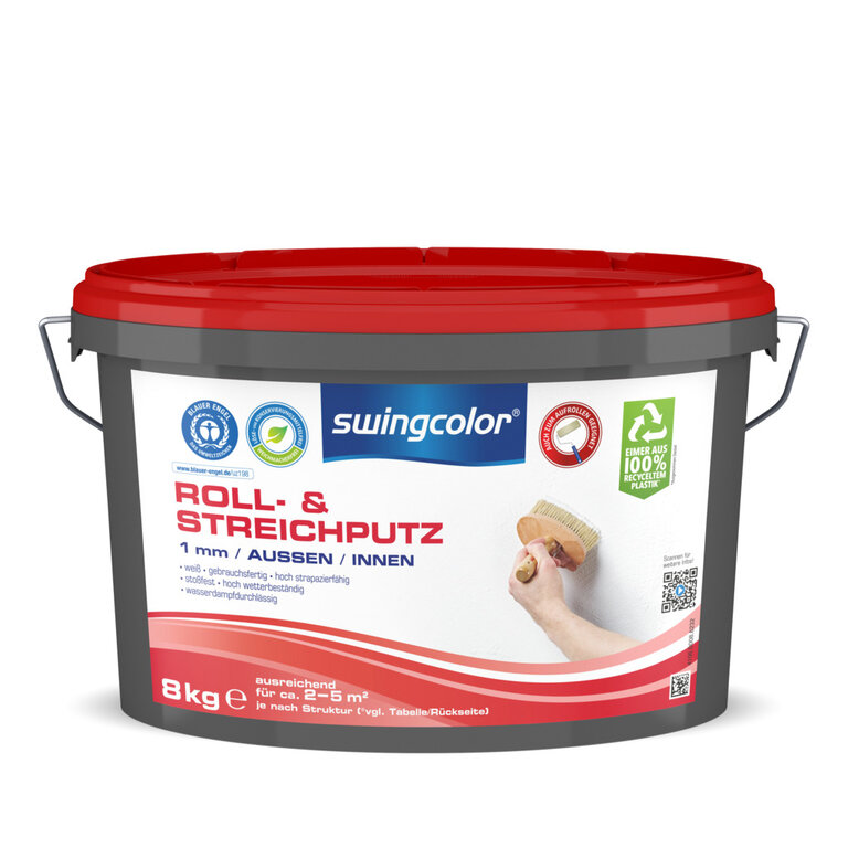 Der swingcolor Roll- & Streichputz ist ein hochwertiger, gebrauchsfertiger Kunstharz-Putz zum Schutz und zur dekorativen Gestaltung von Wand- und Fassadenflächen. Er lässt sich leicht auftragen und bietet unbegrenzte Variations- und Strukturiermöglichkeiten. Er ist hoch strapazierfähig, beständig gegen Industrieabgase, wasserdampfdurchlässig, stoßfest sowie verseifungs- wetter- und scheuerbeständig. Geeignet sind mineralische Untergründe (z.B. Beton, Putz) und Baustoffplatten (z.B. Gipskarton). Verarbeitungstipp: Möbel, Fußböden, Glas, Keramik, Natursteine usw. sollen mit einer Folie oder einem Vlies abgedeckt werden. Fenster, Türen und Fußleisten können mit einem Kreppband abgeklebt werden. Flecken sollten direkt mit einem feuchten Tuch aufgewischt werden. Swingcolor Roll- und Streichputz in einer Schichtstärke von maximal 3 mm auftragen. Mindestens 24 Stunden vor der Verarbeitung empfiehlt es sich ein Grundanstrich mit swingcolor Putzgrundierung durchzuführen. Zur Vermeidung von Ansätzen immer von oben nach unten und nass in nass verarbeiten. Während der Beschichtung einer zusammenhängenden Fläche darf die Arbeit nicht unterbrochen werden. Begrenzungen mit Klebeband abkleben und diese vor der Trocknung wieder entfernen. Neue Putze vor Feuchtigkeitseinwirkung, z.B. Regen, aber auch vor zu schnellem Wasserentzug, z.B. durch starken Wind, Sonneneinstrahlung usw. schützen. Nicht auf Wärmedämmverbundsystemen.