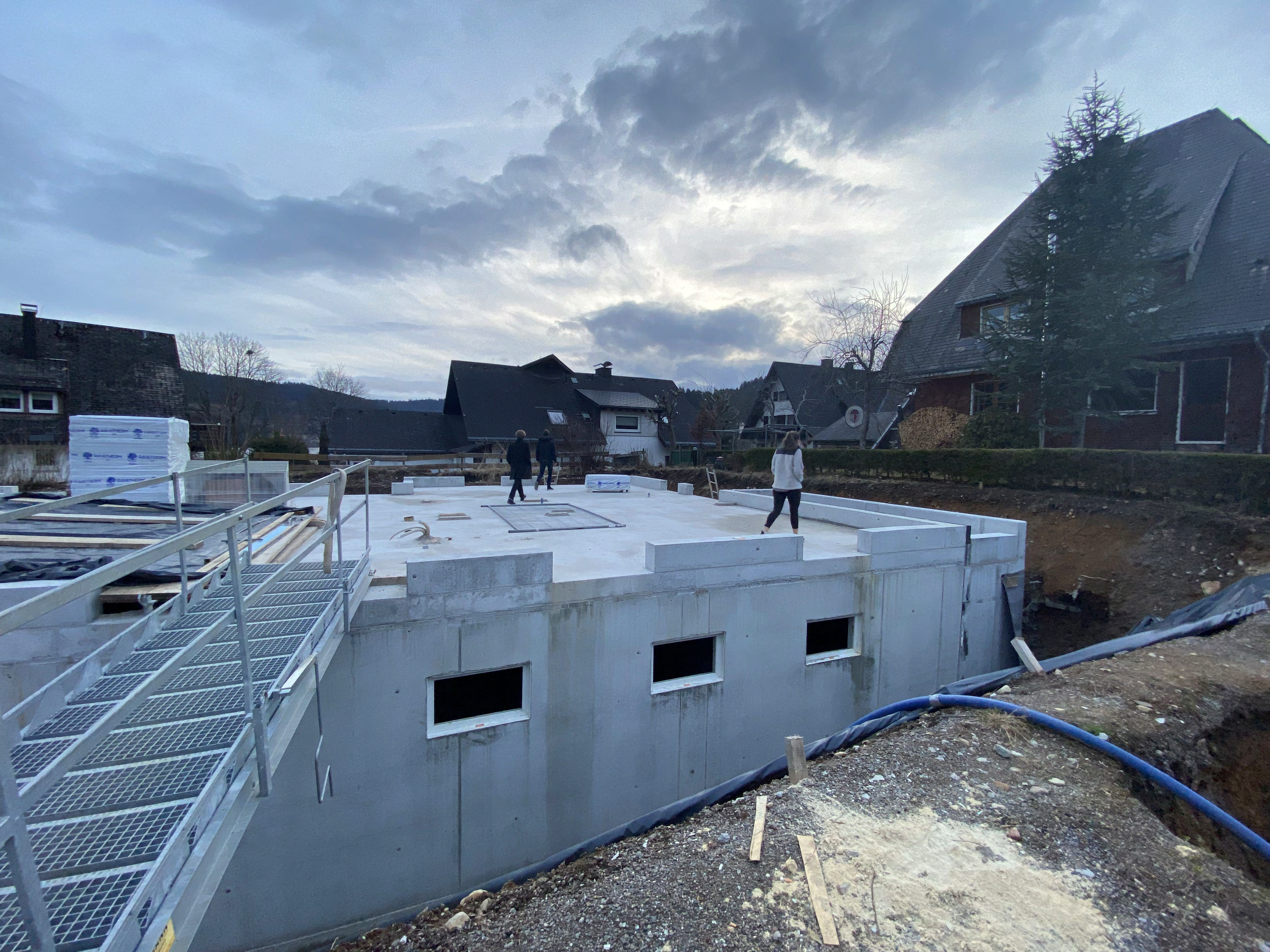 Die Installationen für Abwasser- und Wasseranschlüsse sind erfolgreich abgeschlossen. Zudem wurde eine Regenwasserzisterne im Boden installiert. Für den außenliegenden Kellerabgang wurde eine Betonfertigteiltreppe angebaut. Obwohl diese nicht als konventionelle Sichtvariante hergestellt wird, akzeptiert die Baufamilie das Auftreten von Lunkern – Lufteinschlüssen, die bei der Fertigung entstehen können – und plant, diese später auszubessern.
